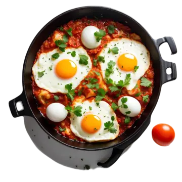 The ingredients for shakshuka include onions, eggs, garlic, chili peppers, bell peppers, and tomatoes are also primarily sourced from local markets and farms and even grown through subsistence agriculture by many families. This is especially true for the eggs which usually come from domesticated chickens in households. Due to the cost and access issues, Produce is not typically organic. Many ingredients in shakshuka, but especially tomatoes are found very often in Algerian dishes.